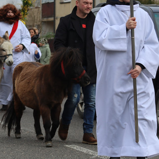 Również i w naszej parafii duża liczba wiernych zgromadziła się na dobrzańskim rynku, by stąd w procesji o godz. 10.40 wyruszyć do kościoła. Procesję prowadził kucyk "Francesca", a obok był prowadzony osiołek "Belmondo" wraz z Jezusem i ks. Dominikiem. Po dotarciu do kościoła rozpoczęła się uroczysta Msza św., która jako pierwszy z obrzędów miała poświęcenie palm. Eucharystii przewodniczył ks. Proboszcz.